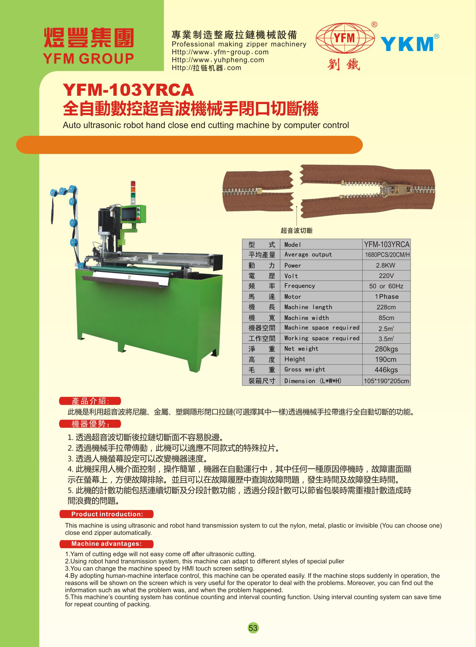 此機的功能是利用超音波將尼龍/金屬/塑鋼閉口拉鏈(可選擇其中一樣)透過機械手拉帶進行全自動切斷的功能。