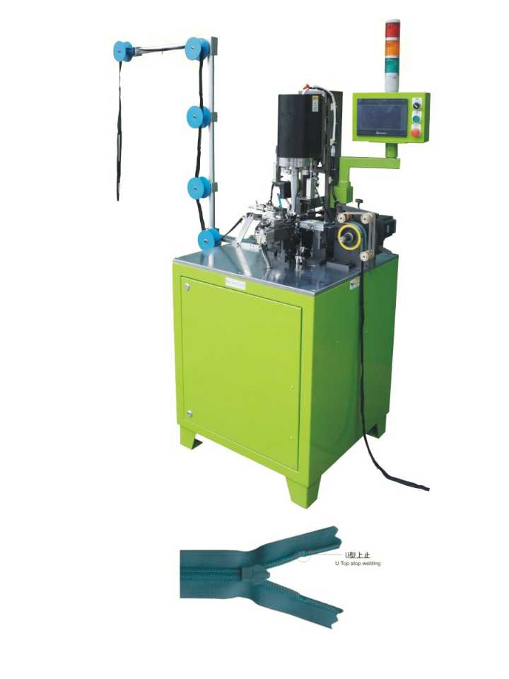 此機(jī)的功能是將隱形或尼龍拉鏈進(jìn)行全自動將尼龍扁線切斷成U型后熔接固定在隱形或尼龍拉鏈上止端的功能。