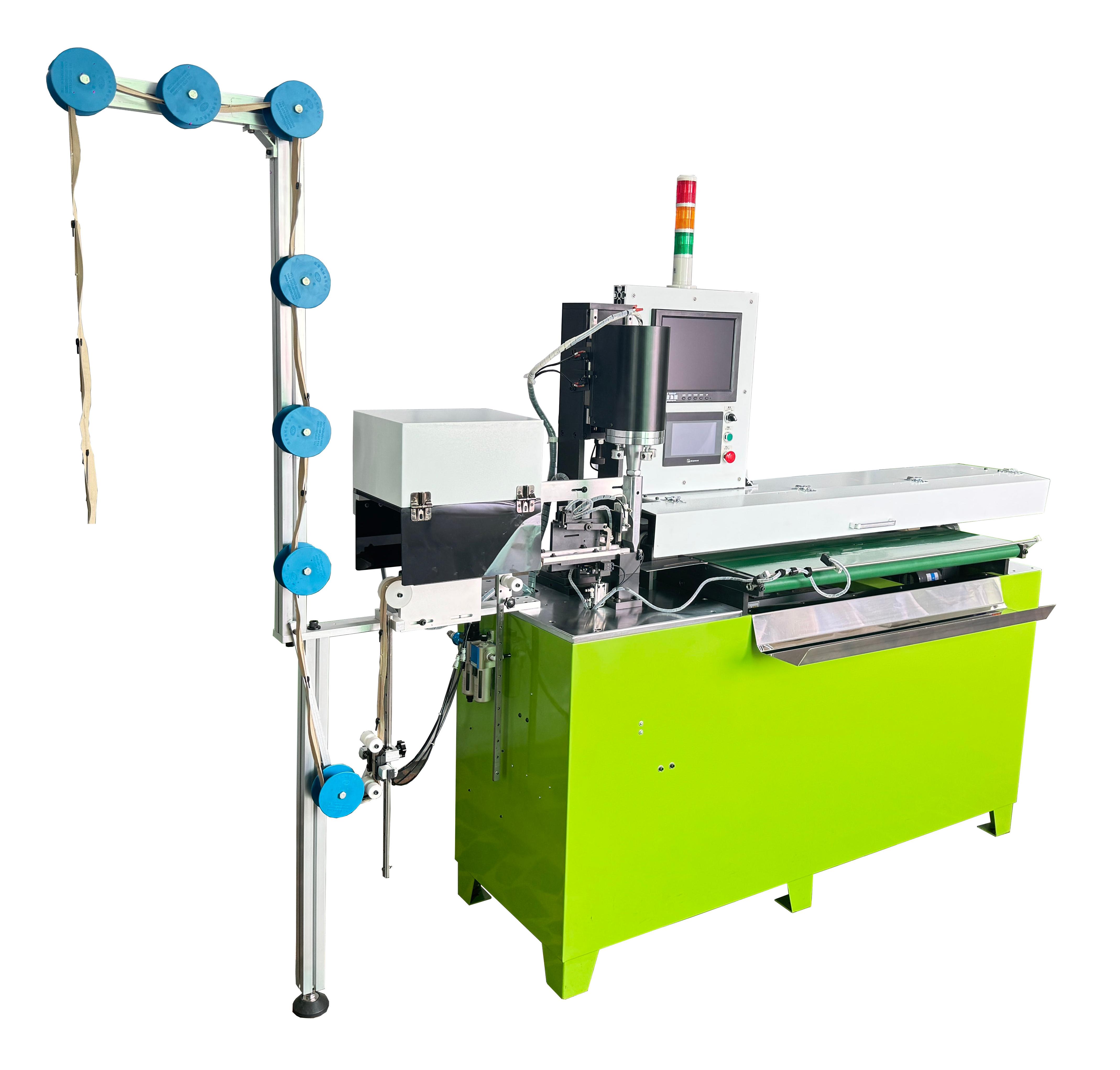 該機器採用超音波和機械手來切斷尼龍、金屬或塑膠開口拉鏈(您可以選擇一種),並且它具有檢測系統(tǒng)來檢查上止、插梢方塊是否有缺失或是位置是否正確以及拉頭形狀及其商標是否正確,如果拉鏈有任何缺陷,它將通過雙層輸送帶將瑕疵拉鏈與好的拉鏈分開存放的功能。