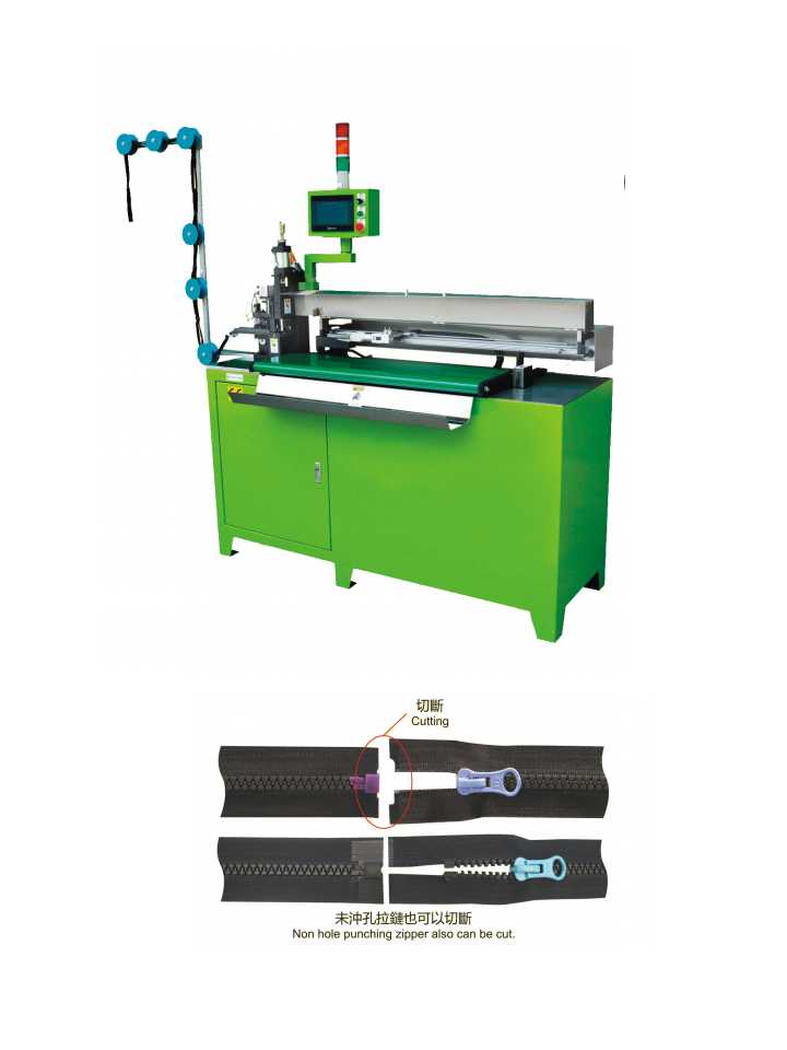 此機(jī)是利用將尼龍/金屬/塑鋼開口拉鏈(可選擇其中一樣)透過機(jī)械手拉帶傳動進(jìn)行全自動切斷的功能。