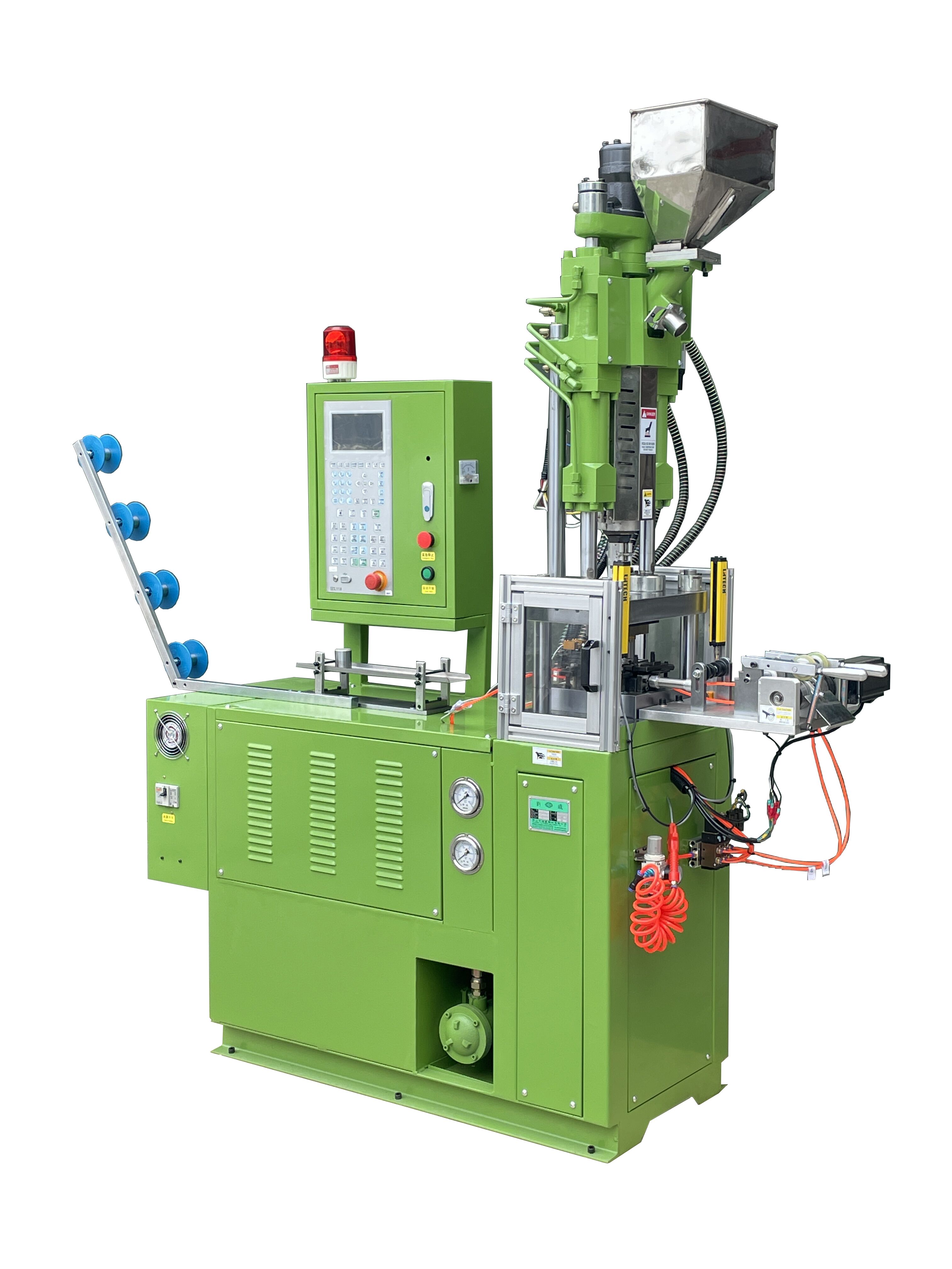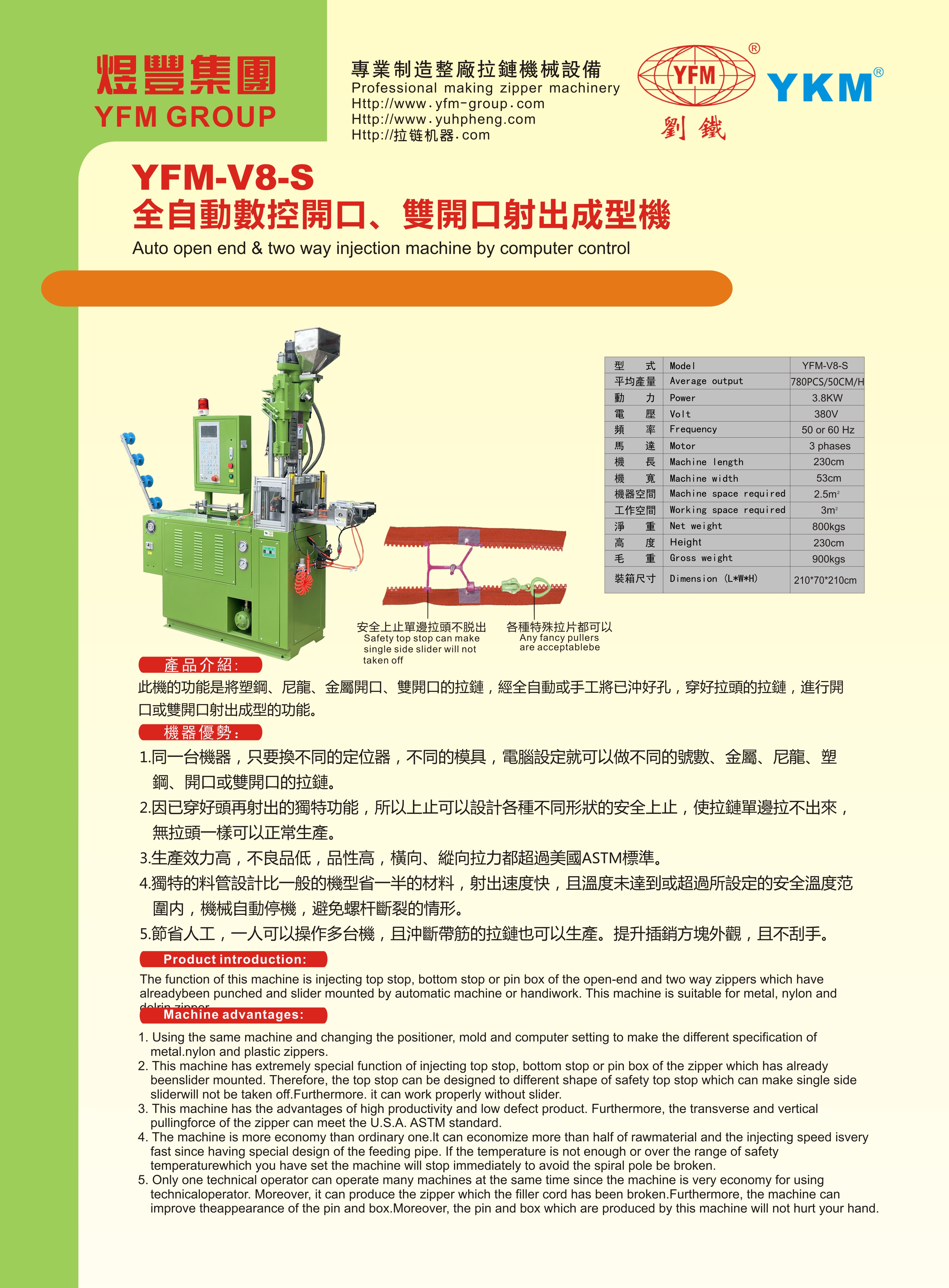 此機(jī)的功能是將塑鋼、尼龍、金屬開口、雙開口的拉鏈,經(jīng)全自動或手工將已沖好孔,穿好拉頭的拉鏈,進(jìn)行開口或雙開口射出成型的功能。
