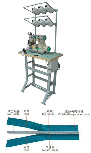 此機的功能是將尼龍成型長碼鏈齒和織好的拉鏈布帶,經過此機,透過上下縫線,將尼龍成型鏈齒和布帶縫合在一起成為尼龍長碼拉鏈的功能。