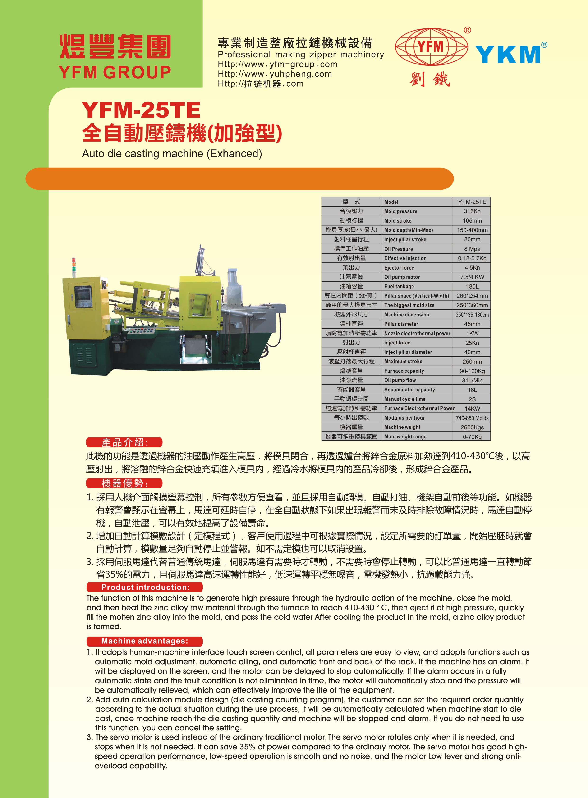 此機(jī)的功能是透過(guò)機(jī)器的油壓動(dòng)作產(chǎn)生高壓,將模具閉合,再透過(guò)爐臺(tái)將鋅合金原料加熱到410-430°C後,以高壓射出,將溶融的鋅合金快速充填進(jìn)入模具內(nèi),經(jīng)過(guò)冷水將模具內(nèi)的產(chǎn)品冷卻後,形成鋅合金產(chǎn)品。