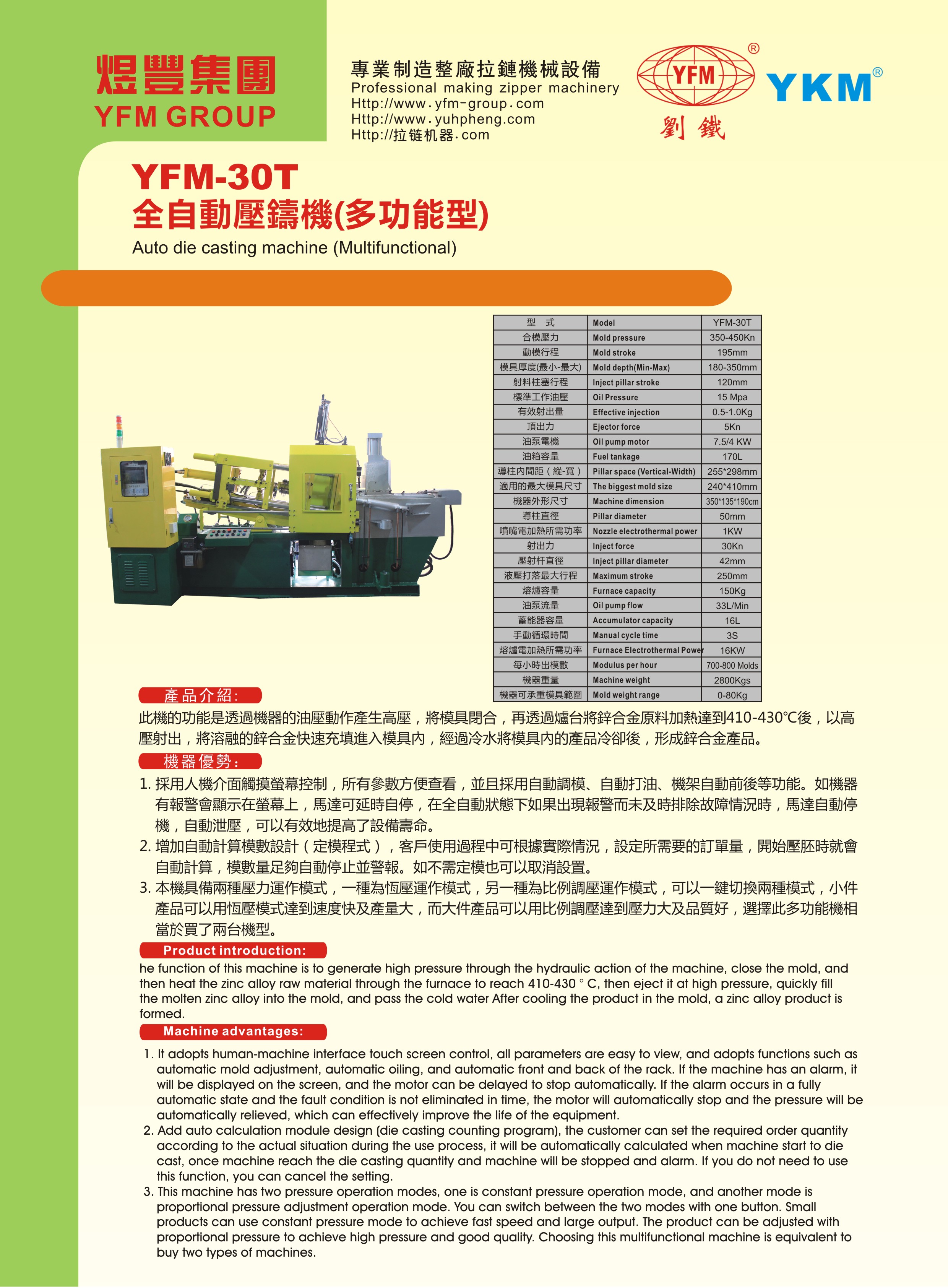 此機(jī)的功能是透過機(jī)器的油壓動(dòng)作產(chǎn)生高壓,將模具閉合,再透過爐臺(tái)將鋅合金原料加熱到410-430°C後,以高壓射出,將溶融的鋅合金快速充填進(jìn)入模具內(nèi),經(jīng)過冷水將模具內(nèi)的產(chǎn)品冷卻後,形成鋅合金產(chǎn)品。