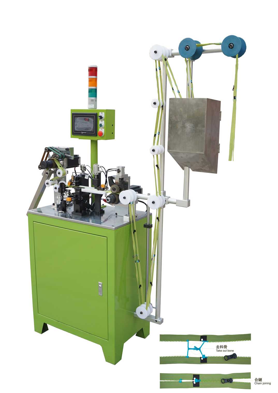 此機(jī)的功能是將塑鋼或是尼龍注塑帶拉頭開口射出拉鏈的料骨去除并進(jìn)行合鏈的功能。