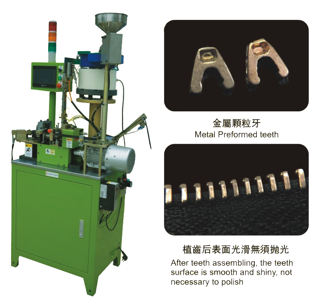 此機的功能是將以拋光處理后的顆粒金屬牙齒夾入固定在金屬拉鏈布帶上成為金屬長碼拉鏈的功能。此機適用于金屬拉鏈規(guī)格#3,#5,#8,#13。