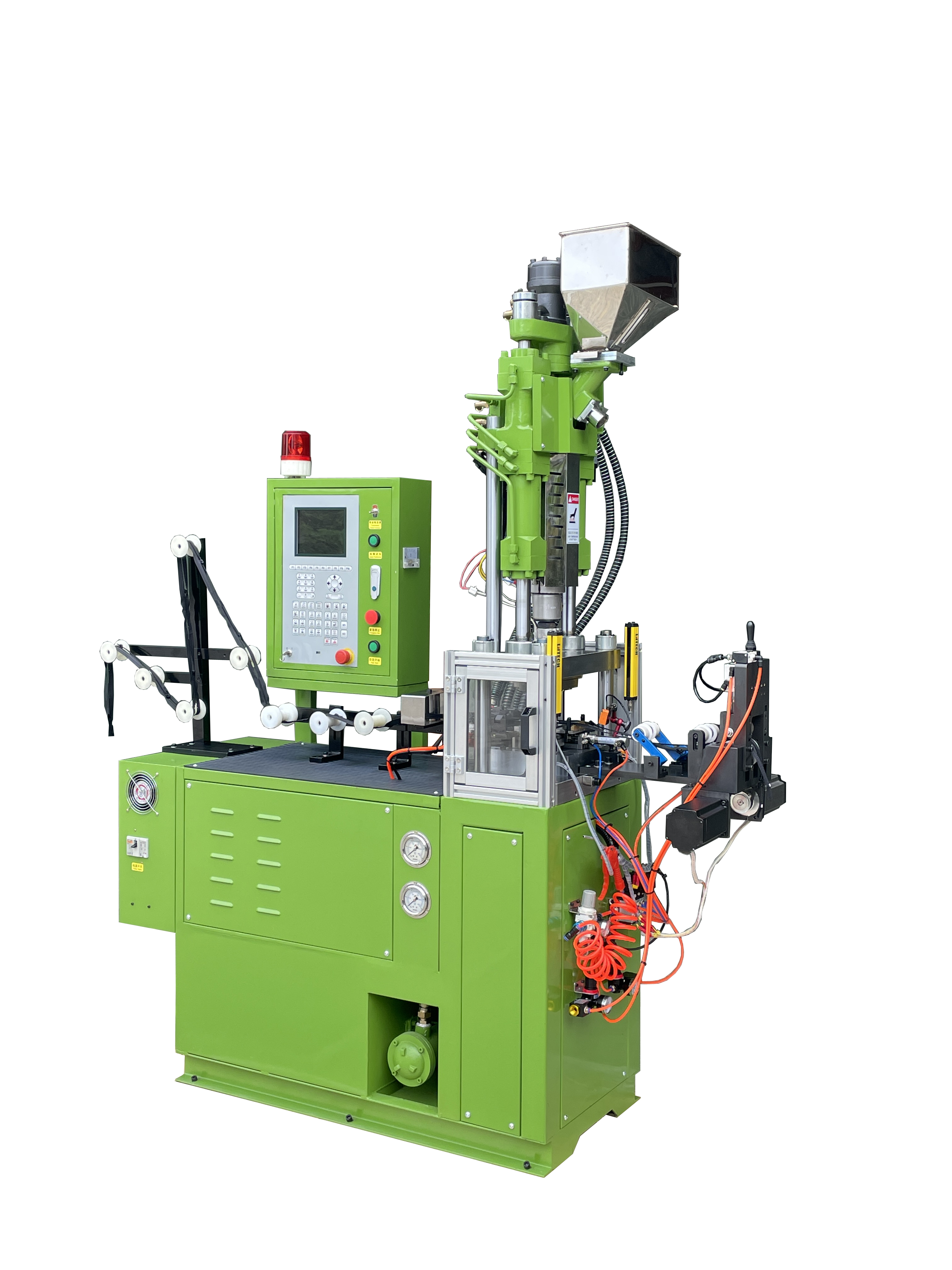 此機(jī)的功能是將尼龍、塑鋼、金屬開口或閉口拉鏈,將全自動(dòng)穿好拉頭的拉鏈,進(jìn)行一次性射出成型的功能。