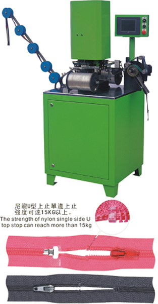 The function of this machine is to cut the nylon wire to be U shape automatically, and then weld those U top stop on the open-end zipper which has been welded with film as well as the open-end/close-end zipper