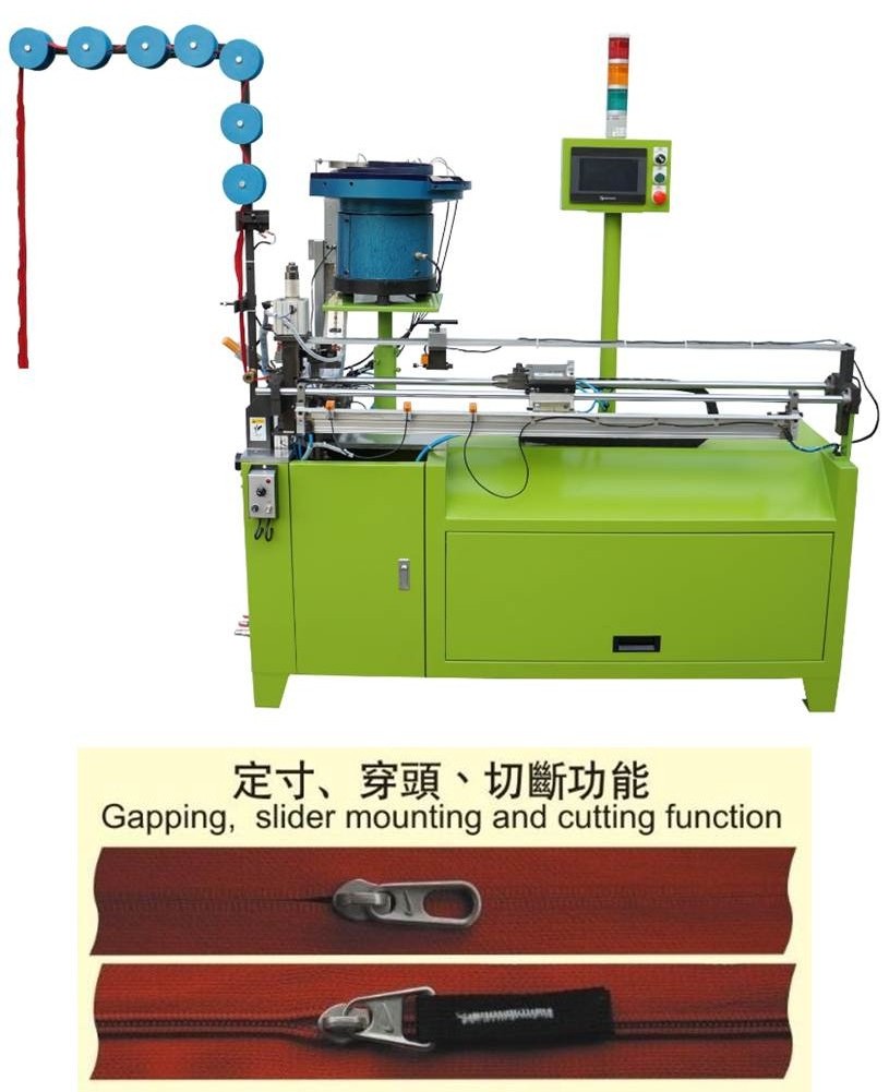 The function of this machine is to mount the normal or reverse sliders into the long chain zipper (without wasting gapping space) and it also can close off the zipper and cut the zipper.