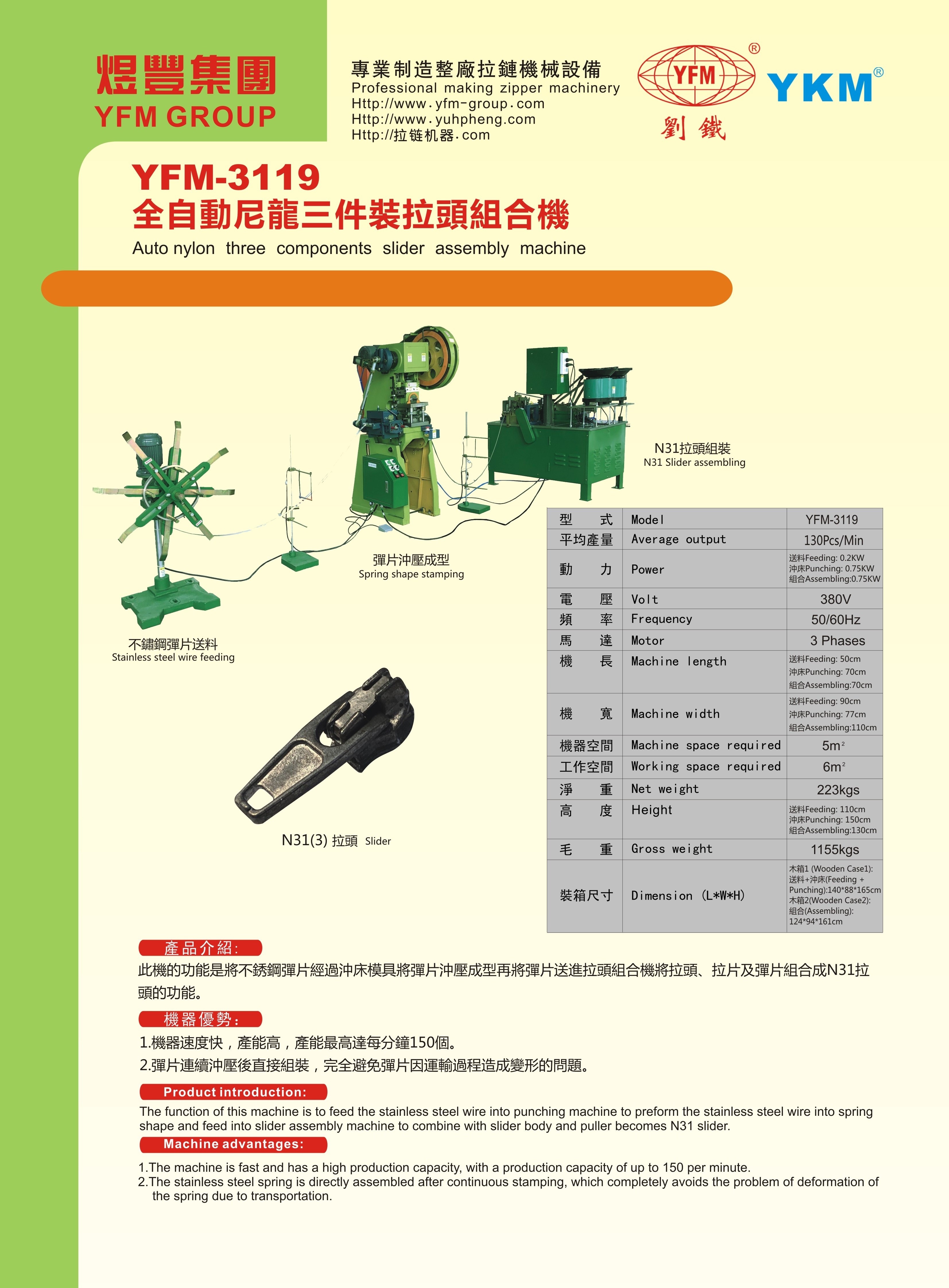 The function of this machine is to feed the stainless steel wire into punching machine to preform the stainless steel wire into spring shape and feed into slider assembly machine to combine with slider body and puller becomes N31 slider.